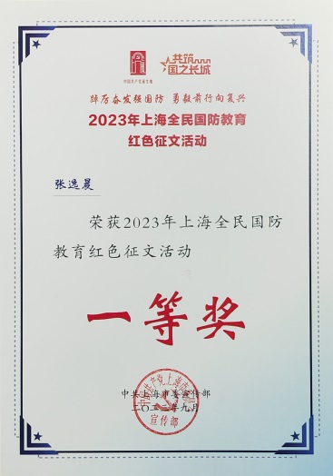 beat365官网学生荣获上海市“爱我国防”主题征文活动一等奖