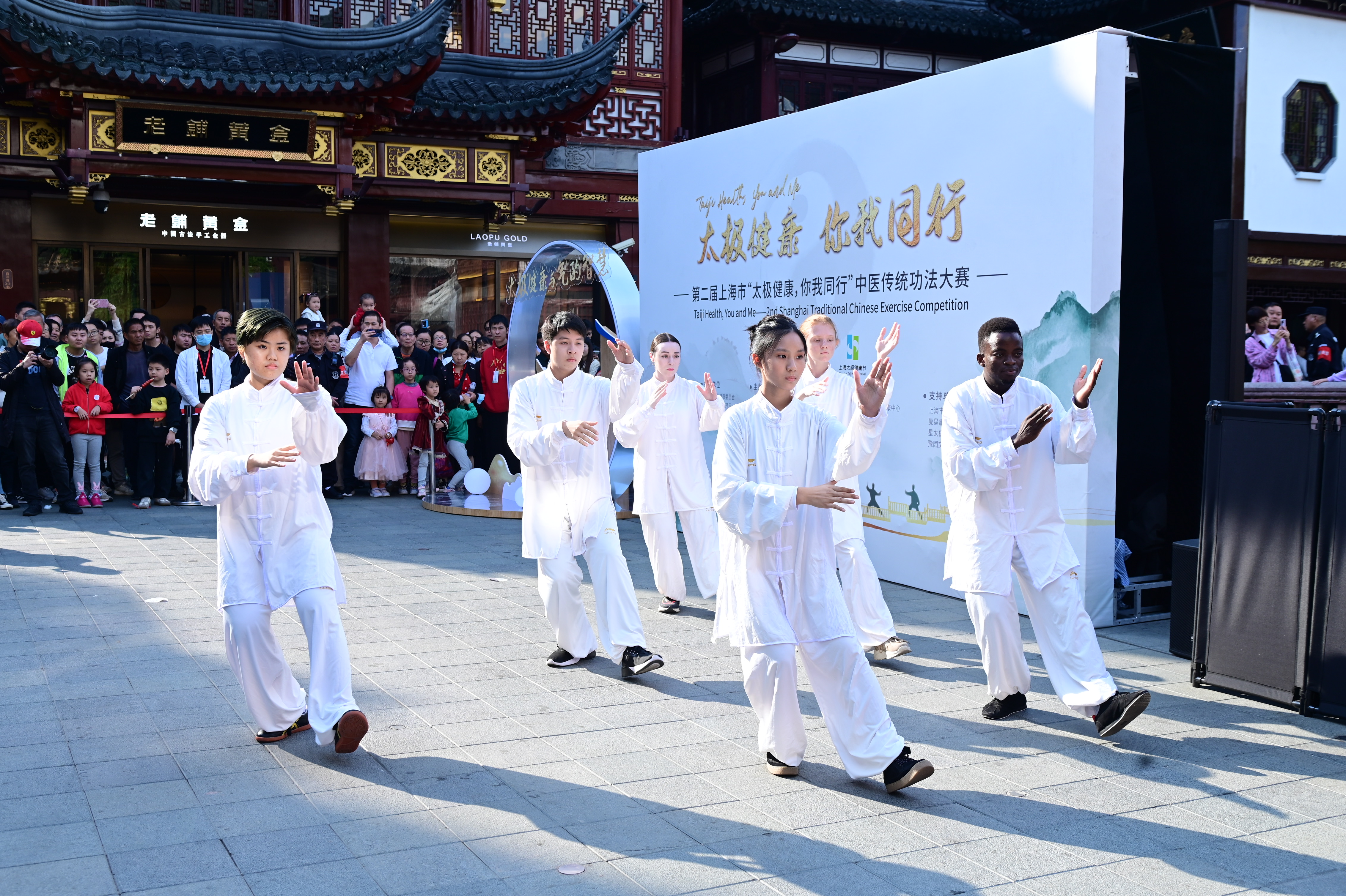 今天的海派文化地标豫园九曲桥广场游人如织,近处豫园的亭台楼阁与远处楼群摩天的陆家嘴交相辉映,在传统与现代的连接点,上海气功研究所气道书院外籍学员团队、beat365官方网站附属闵行蔷薇小学“五行操”团队以及复星集团旗下星太极进行传统功法展演,并与游客分享太极文化,体验非遗太极拳的抱手礼,一同感受优秀传统文化的魅力。