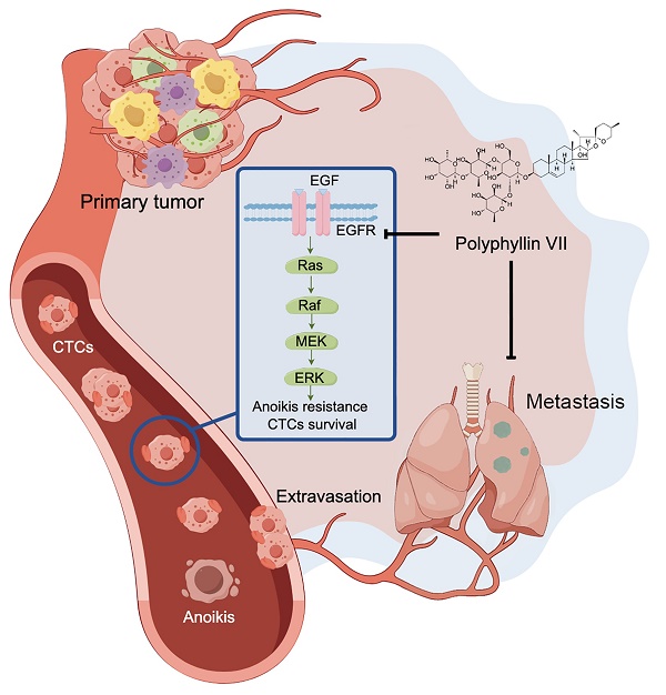 本项研究发现临床常用抗癌中药重楼的有效单成分重楼皂苷Ⅶ可通过抑制EGFR通路诱导CTC失巢凋亡,进而抑制肺癌的转移。该发现为中药抗肺癌转移提供了依据,也为“扶正治癌”学术思想指导肺癌转移防治提供了科学证据。