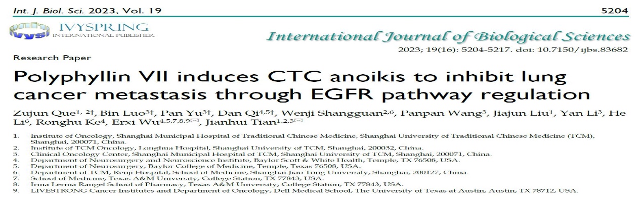近日,beat365官网附属市中医医院田建辉教授团队在《International Journal of Biological Sciences》在线发表了题为“Polyphyllin VII induces CTC anoikis to inhibit lung cancer metastasis through EGFR pathway regulation”的研究论文,揭示重楼皂苷Ⅶ干预循环肿瘤细胞抑制肺癌转移的作用及机制,为“正虚伏毒”肺癌复发转移核心病机理论提供了科学依据。