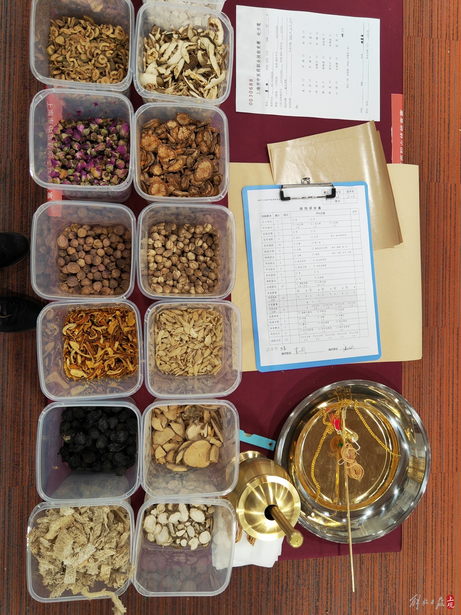 麦冬、芦根、白芷、豆蔻、乌梅、路路通、丝瓜络、玫瑰花、山楂、茯苓……比赛台子上,共有18味药方分两列排开,形态各异且不标品名。根据不同汤剂处方笺,选手面对药盒内的20种中药饮片,既要快速辨认,又要在规定时间内临方炮制、配方戥药,完成18味药共五剂的调剂、包装和捆扎。如此高强度赛项,伴随着阵阵捣药之声,让选手们既紧张又兴奋,不少人还来不及用绳子“串”起中药包,“终场”铃声就响起了。
