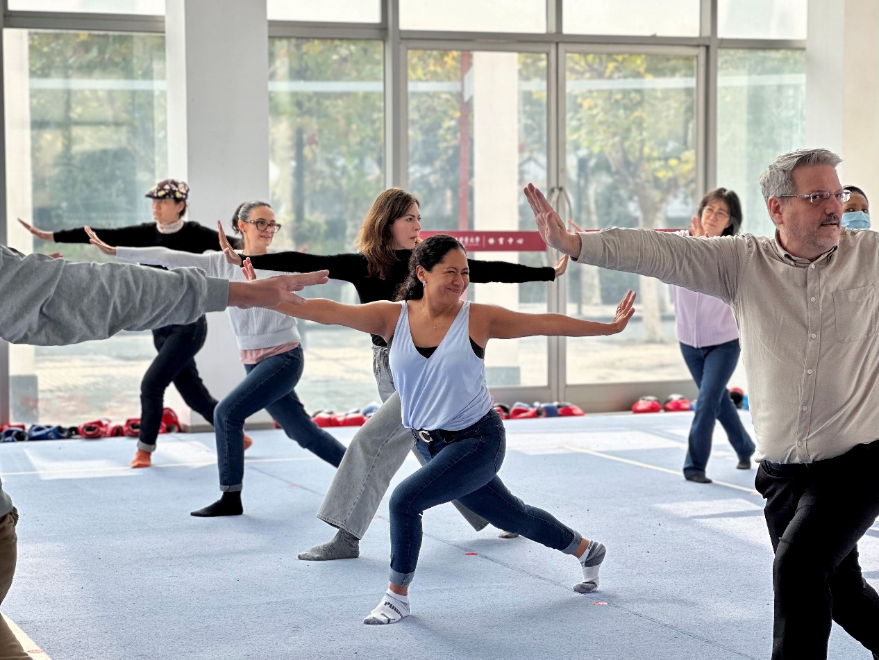 在传统功法练习区,来宾们积极参与传统功法体验。这一环节不仅促进了国际来宾之间的交流,也让大家亲身体验到中国传统文化的博大精深。