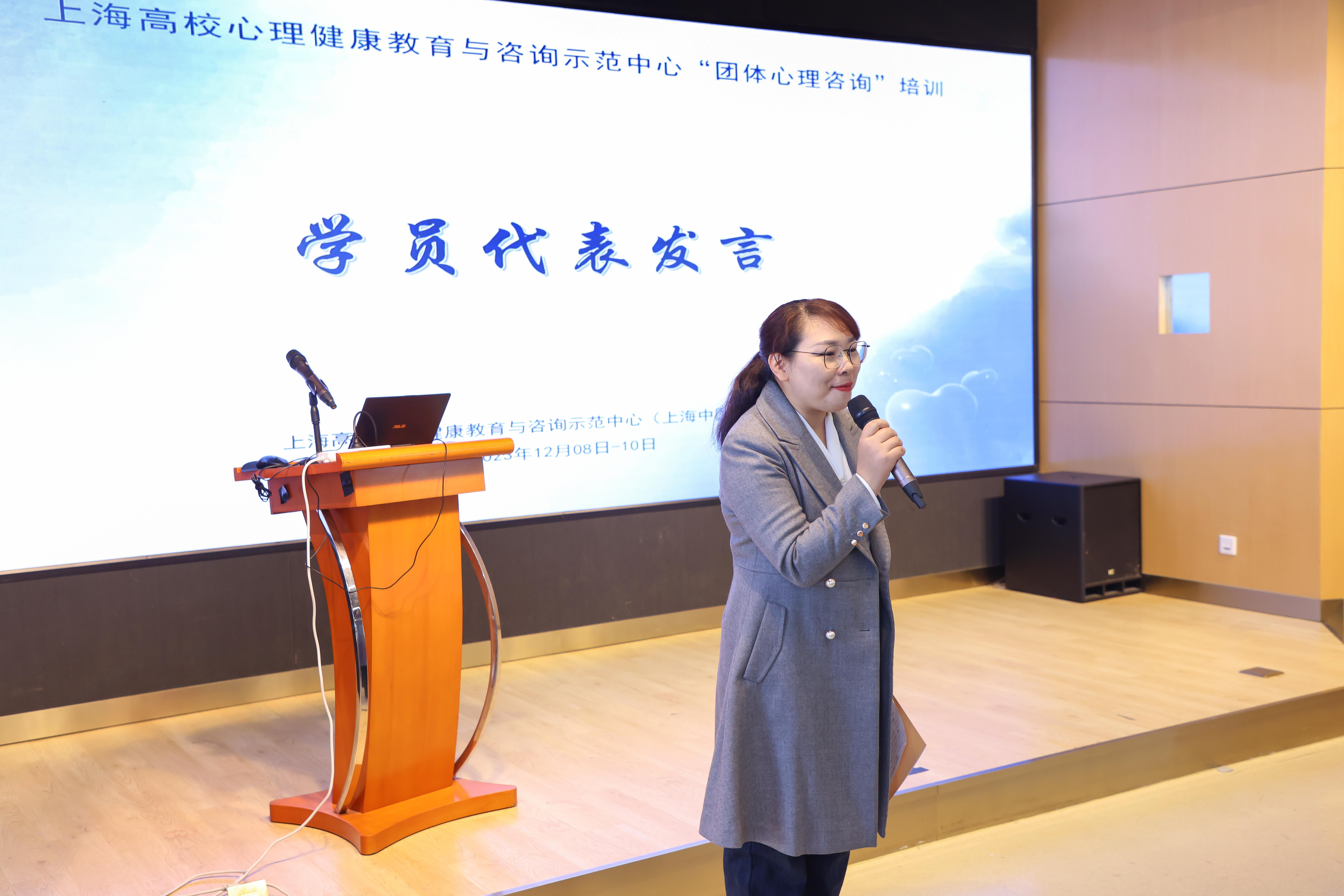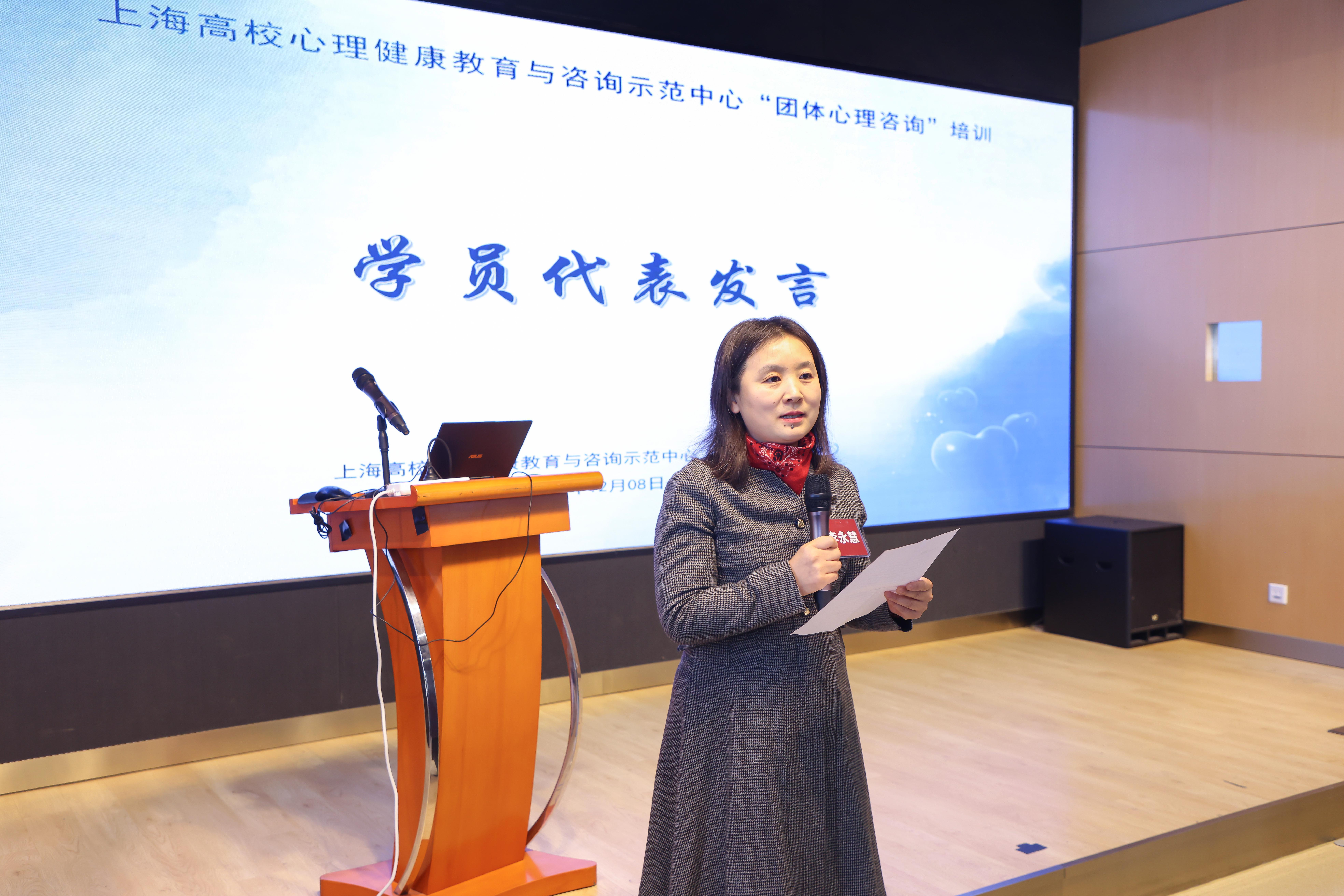 beat365官方网站学工部副部长王鑫讲话。他指出,党中央、国务院高度重视学生心理健康工作,加强学生心理健康工作已上升为一项国家战略。作为上海市心理示范中心,beat365官方网站将通过团体心理咨询培训,进一步增进区域辐射效应,促进资源共建共享,推动上海学校心理健康服务体系建设,更好地服务全国心理健康教育工作者的专业发展。