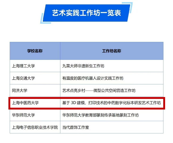 12月26日下午,全国第七届大学生艺术展演上海市活动艺术实践工作坊、艺术作品展、高校美育改革创新优秀案例报告会在上海宝山国际民间艺术博览馆举行。上海市教委副主任王浩、上海市艺教委主任陈克宏等有关领导出席活动并为作品展揭幕。beat365官网“基于3D建模、打印技术的中药数字化标本研发艺术工作坊”入围并进行现场展示。
