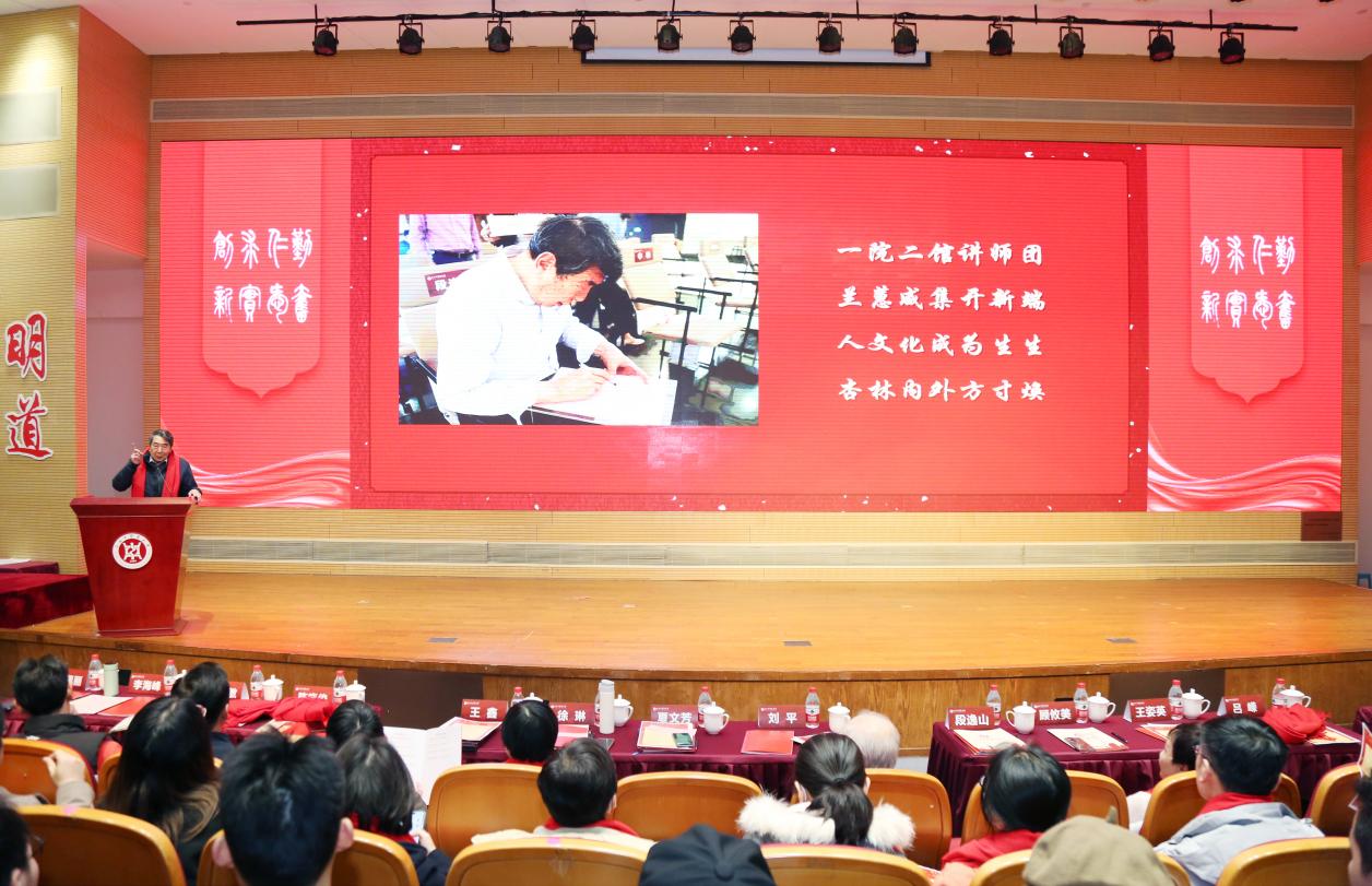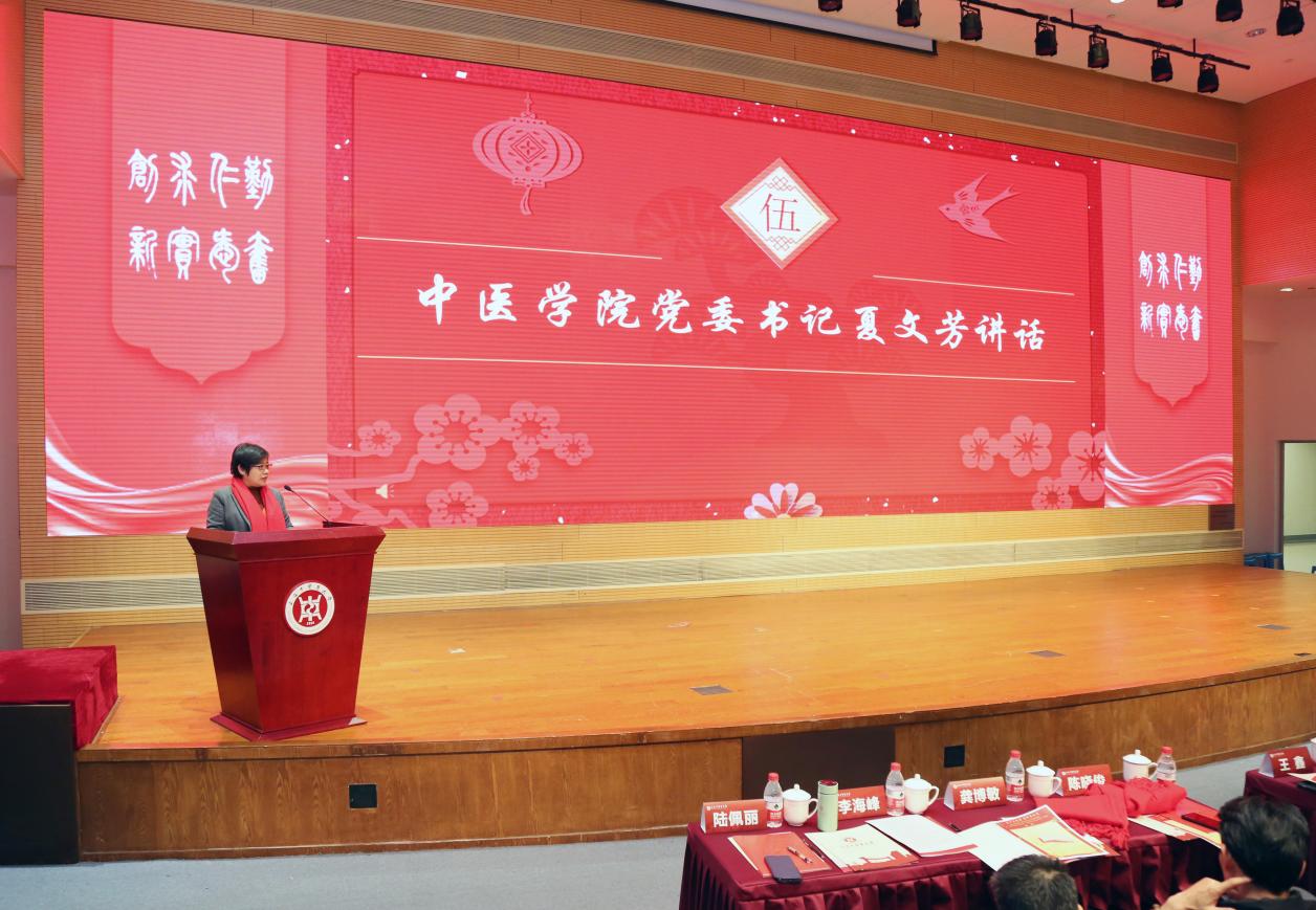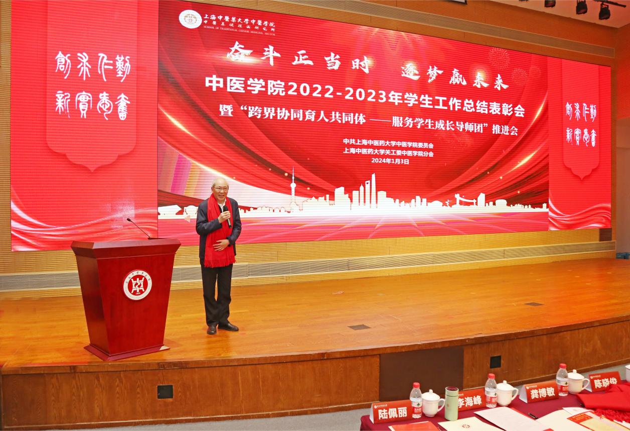 新年伊始,中医学院以一场接地气、聚人气、冒热气的学生工作大会谋新篇、开新局、聚新力。13日,中医学院2022-2023年学生工作总结表彰会暨“跨界协同育人共同体——服务学生成长导师团”推进会在图书馆裙楼四楼报告厅举行。学校“生生”导师团团长、终身教授段逸山,杏林春华导师团团长、终身教授刘平,仁术合一导师团团长、退休党委副书记顾攸美受邀出席大会。学校相关职能部门,图书馆、上海中医药博物馆、体育部等党建共建单位,上海市档案馆、陈云纪念馆等合作单位的相关同志,青年教师班主任、辅导员、家长代表、全体在校生参加会议。中医学院党委副书记陆佩丽主持会议。