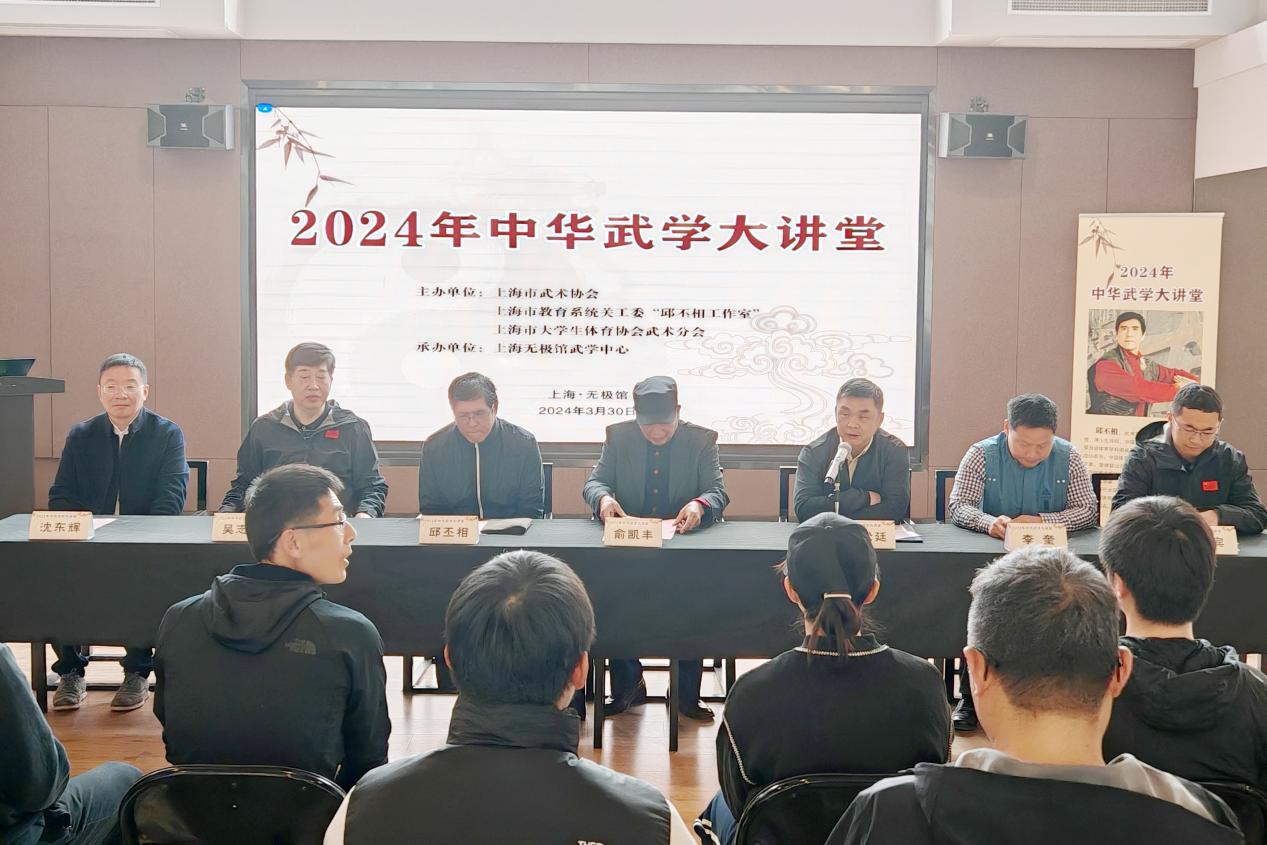 为提高学校武术师资理论水平,进一步推动武术进校园工作深入开展,3月30日,2024年中华武学大讲堂在上海无极馆成功举办。此次活动由上海市武术协会、上海市教育系统关工委“邱丕相工作室”和上海市大学生体育协会武术分会联合举办,上海无极馆武学中心承办,共吸引来自26家单位的30余名沪上大中小学武术教师报名参加。