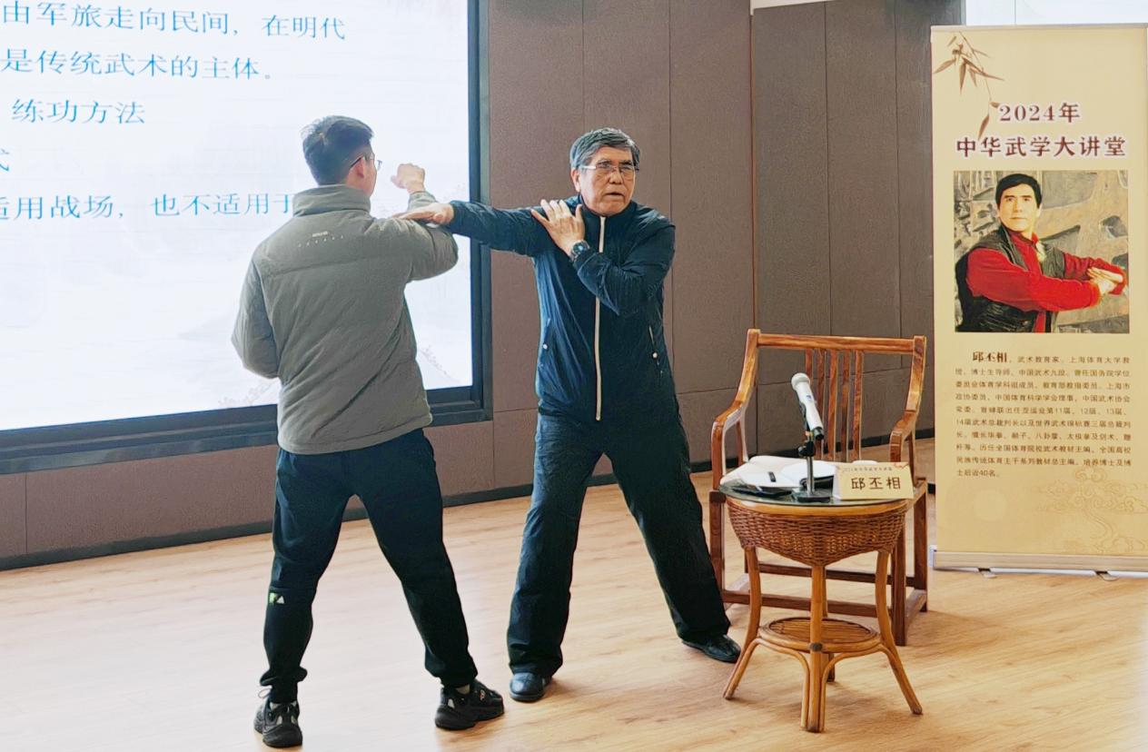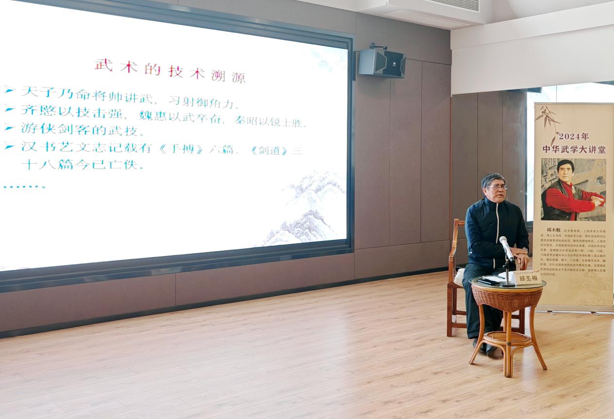 2024年中华武学大讲堂第一讲由邱丕相担任主讲人,邱丕相站在中华民族伟大复兴的战略高度做了一场精彩的中华武学盛宴,从价值层面详细讲述了武术临战实用型技法、预设攻防型技法、艺术演练型技法三种武术技术形态,并从文化结构深度解读武术技术器物层、制度习俗层、理论思想层三种武术文化形态。邱丕相认为技术是文化,技术中有文化,技术蕴含传统文化,技术延伸文化。武术是一个以技术为主体,以民族精神为灵魂的完整文化体系。中国武术既不是唯技击的实用技术,也不是唯美主义的身体艺术,而是一种提炼了的攻防技术,一种灵巧、多样、充满假设、富有艺术性的攻防技艺,是诗化了的格斗技术。用以防身、健身、修为、教化、娱乐、观赏,以及由此衍生的程序、规约、礼仪、习俗、思想、精神等,构成了武术文化。