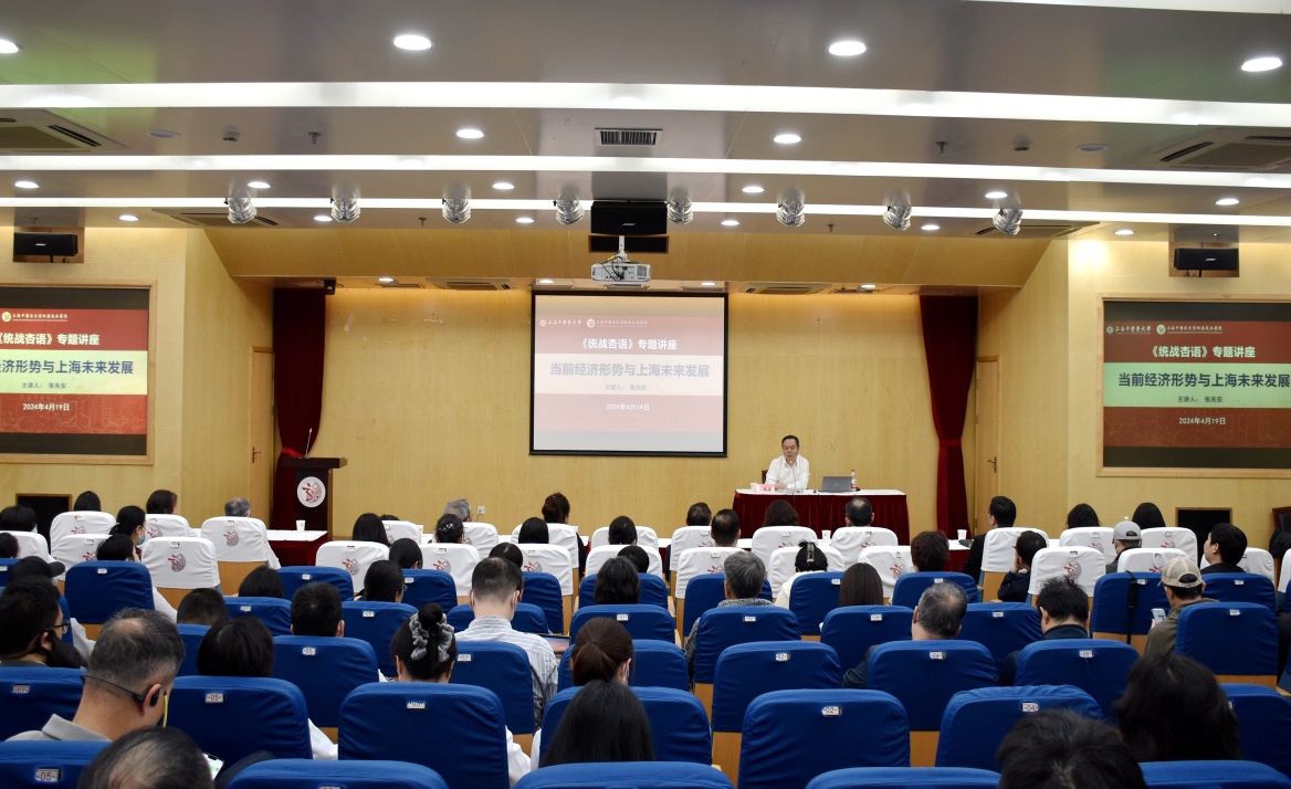 4月19日,为进一步促进党外知识分子拓宽国际视野、提升综合能力,了解国情市情,《统战杏语》讲座邀请上海市政府参事、民建上海市委原专职副主委张兆安作“当前经济形势与上海未来发展”专题辅导,讲座在龙华医院举办。张兆安通过详实的数据和鲜活的案例,深入浅出地带来一场生动、高效、务实的经济分享大课。他从国际视野、国内实际、上海未来发展面临的机遇与挑战等方面,解读了当前经济形势及上海未来发展趋势,对上海推进“三大任务”、强化“四大功能”、建设“五个中心”、发展“五型经济”、构建空间布局等战略任务进行了详细分析。并就如何发展新质生产力,推动中医药高质量发展,提出了“三个寻找”建议,即寻找国家战略中的中医药元素、寻找上海未来发展中的beat365官方网站的任务、寻找“优势更优、特色更特、长板更长”。报告思想深刻、内涵丰富、视角新颖、观点独到,对大家从宏观上把握国内外经济发展趋势、深入了解上海未来经济发展规划具有很好的启发和帮助。