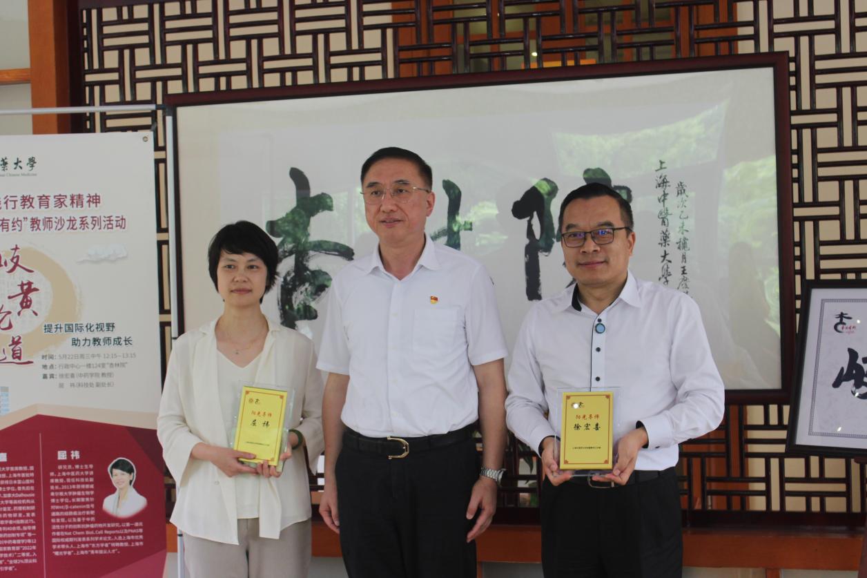 5月22日中午,第46期“岐黄论道·杏林有约”教师沙龙在学校行政中心一楼杏林院举行。活动围绕“提升国际化视野,助力教师成长”主题,邀请两位海外留学归国教师代表——beat365官网首席教授、中药学院名誉院长、国家特聘专家徐宏喜,以及上海市“东方学者”特聘专家、市政协常委、校科技处副处长屈祎担任嘉宾,并为他们颁发“阳光导师”聘书。活动由宣传部(党委教师工作部)、组织部(统战部)、科技处、中药学院联合举办。校党委副书记沈辉,相关职能部门负责人、中青年教师、研究生代表等50余人现场参与,活动由宣传部(党委教师工作部)副部长刘虹主持。