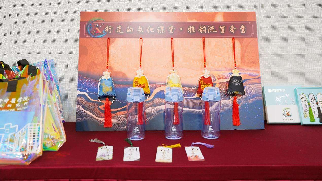 “行走的文化课堂”致力于以展促创,以研发文创作品的方式,将文物的深度、历史的厚度、文明的广度融入中医药文化的“双创”行动。活动现场,一系列由学生团队研发的文创产品亮相。“行走的文化课堂”徽标描绘了一位书童右手持扇,左手点墨,行走在广袤的祖国大地上的特色形象。学生团队还延伸设计了带有徽标的水杯,体现中医望闻问切诊法思维的“四诊书签”,由上海市名中医、学校终身教授王庆其组方配伍的基于中医“五行学说”的“雅韵流芳香囊”等,展现了中医药文化的深厚底蕴。