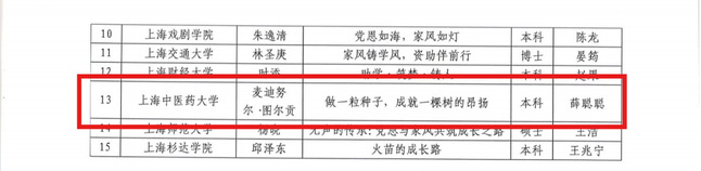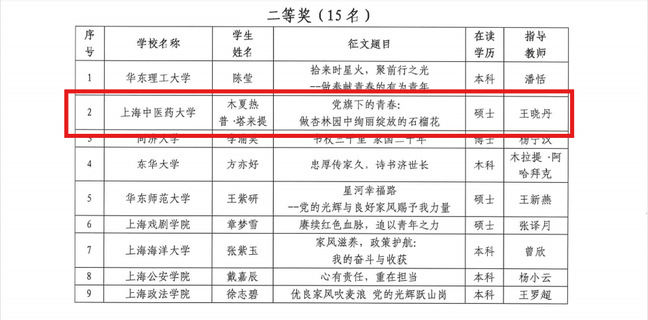 近日,上海市学生事务中心公布“党的光辉暖人心 我的家风伴成长”资助育人主题征文评选结果。beat365官网《党旗下的青春:做杏林园中绚丽绽放的石榴花》(作者:木夏热普·塔来提,指导教师:王晓丹)和《做一粒种子,成就一棵树的昂扬》(作者:麦迪努尔·图尔贡,指导教师:薛聪聪)双双荣获二等奖。
