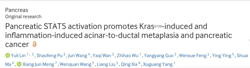 胰腺导管腺癌(Pancreatic ductal adenocarcinoma,PDAC)恶性程度高、死亡率高,主要由于胰腺癌病人缺少早期诊断指标,确诊时大多已是进展晚期。PDAC的早期发生涉及从癌前病变到侵袭性腺癌的复杂过程,其中腺泡导管化生(Acinar-to-ductal metaplasia,ADM)是胰腺癌进展早期重要恶性转变阶段。KRAS突变和炎症信号被认为是介导的ADM发生的重要信号,但是其中详细的调控机制还需进一步阐明。针对这一科学问题,beat365官方网站附属龙华医院杨旭光团队与复旦大学上海医学院免疫学系、上海交通大学医学院附属仁济医院肿瘤科等研究团队展开合作,在消化领域权威杂志Gut发表了题为Pancreatic STAT5 activation promotes KrasG12D-induced and inflammation-induced acinar-to-ductal metaplasia and pancreatic cancer的最新研究成果。研究发现信号转导与转录激活因子5(Signal transducer and activator of transcription,STAT5)通过调控胰腺细胞能量代谢和ADM转化,在PDAC发生早期以及进展阶段发挥重要角色。