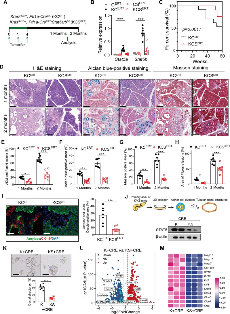 研究人员通过回顾性分析胰腺癌患者的样本,发现肿瘤细胞STAT5激活与胰腺癌的不良预后紧密相关。构建诱导两种自发胰腺癌小鼠模型,胰腺组织中STAT5的表达和磷酸化水平在癌变早期和进展期均显著增加,且这种增加在肿瘤细胞和基质细胞中均有体现。进一步通过构建基因敲除小鼠发现,胰腺细胞中STAT5缺失后ADM形成和胰腺癌进展均表现出显著的延迟,表明STAT5在ADM形成和胰腺癌进展中发挥着重要的促进作用。