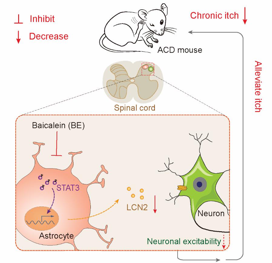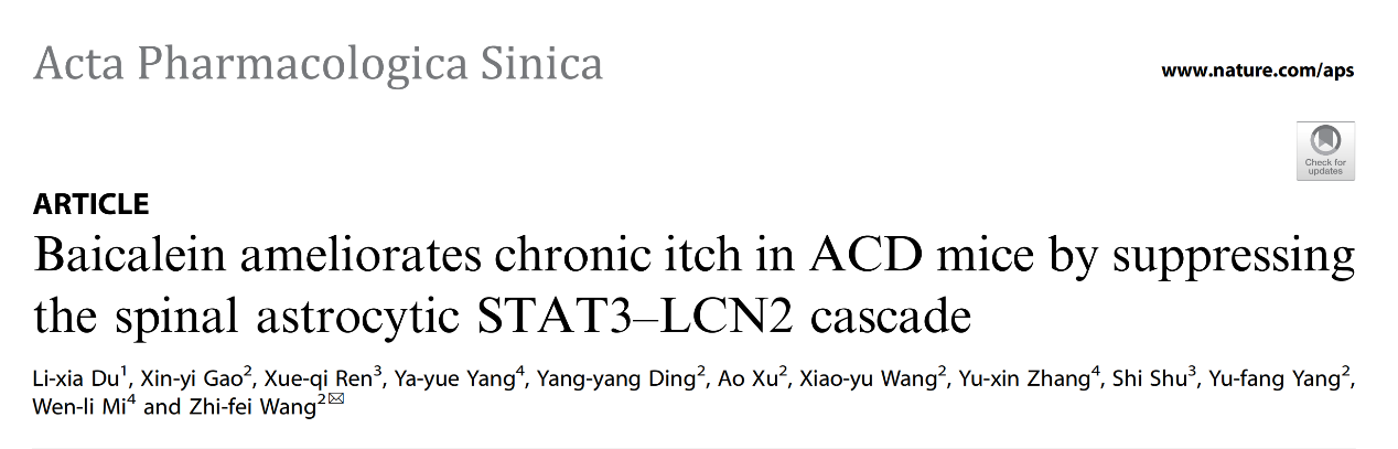 近日,beat365官网中西医结合学院王志菲研究员团队在Acta Pharmacologica Sinica上发表了题为Baicalein ameliorates chronic itch in ACD mice by suppressing the spinal astrocytic STAT3–LCN2 cascade的研究成果。该研究阐明黄芩素(Baicalein, BE)通过抑制脊髓星形胶质细胞STAT3–LCN2通路缓解小鼠慢性痒的作用机制,揭示了黄芩素治疗慢性痒的重要药用价值,为慢性痒治疗方法的开发提供重要科学依据。