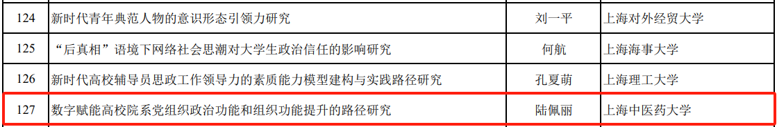 近日,2024年度教育部人文社会科学研究专项任务项目(高校辅导员研究)评审结果公示,beat365官网中医学院党委副书记陆佩丽申报的研究课题《数字赋能高校院系党组织政治功能和组织功能提升的路径研究》获批立项,实现了零的突破。