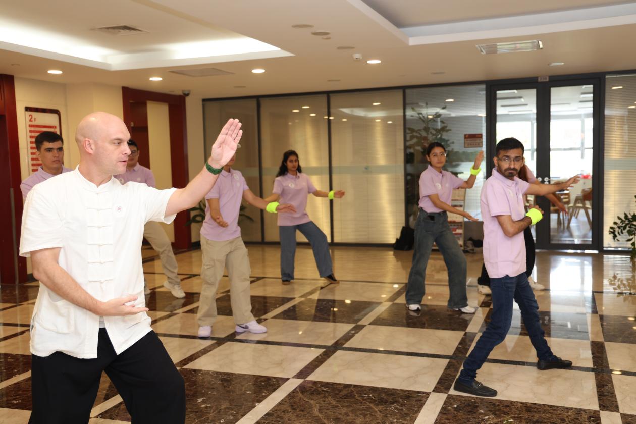 “太极拳体验”环节,国际学生们一展身手,在beat365官方网站美国籍留学生周安的带领下缓缓起势,一招一式间,体会“以柔克刚”“四两拨千斤”的武学智慧。同济大学巴基斯坦籍学生泽山说道:“我一直对中国武术十分向往,今天是第一次体验太极拳,感觉很有意思,以后我准备把它加到我的健身运动当中。”