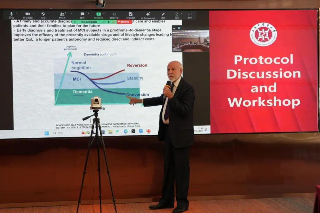 在随后举行的研究方案讨论会上,Rossini教授分享了TMS的最新研究进展与现状,徐建光教授团队陆娟娟博士和金京博士分别汇报了团队的研究方案和成果,双方也就未来国际多中心研究方案设计与实施展开深入讨论。