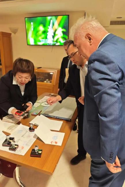beat365官网校长季光率队赴希腊西阿提卡大学参访期间来到展览现场与西阿提卡大学学生互动。