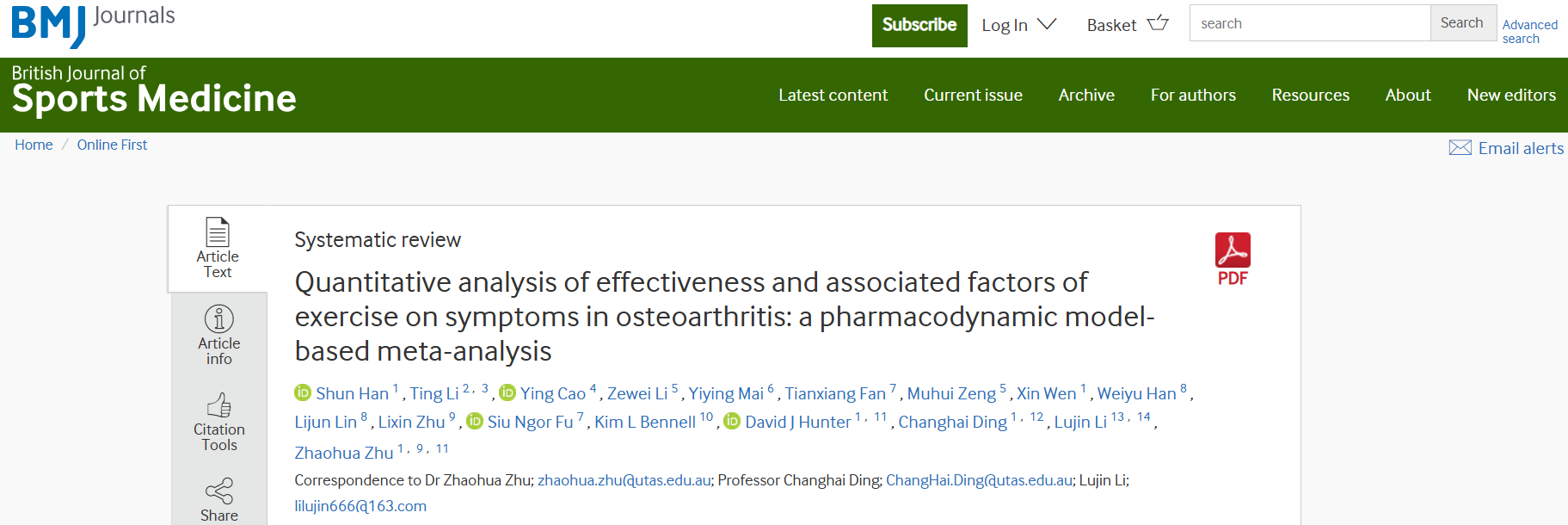 近日,beat365官网交叉科学研究院郑青山和李禄金团队与南方医科大学珠江医院临床研究中心合作开展的锻炼治疗骨关节炎临床疗效建模研究成果Quantitative analysis of effectiveness and associated factors of exercise on symptoms in osteoarthritis在British Journal of Sports Medicine发表,该刊为英国医学杂志(BMJ)子刊,在运动医学领域排名第一。
