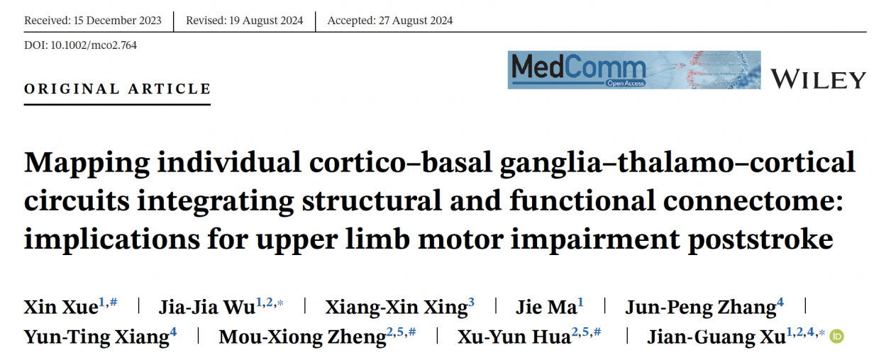 近日,beat365官网附属岳阳中西医结合医院大康复学科首席专家徐建光教授团队在MedComm杂志在线发表了题为Mapping individual cortico–basal ganglia–thalamo–cortical circuits integrating structural and functional connectome: implications for upper limb motor impairment poststroke的研究论文。该研究发现,皮质-基底节-丘脑-皮质(cortico-basal ganglia-thalamo-cortical,CBTC)短环路中“初级运动皮质(primary motor cortex,M1)-尾状核”连接可预测脑卒中患者上肢运动功能恢复情况,为神经环路调控新策略提供新靶标。