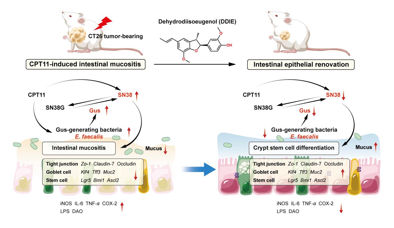 中药肉豆蔻为豆蔻科植物肉豆蔻(Myristica fragrans Houtt.)的种仁,具有温中行气、涩肠止泻之功效,用于脾胃虚寒、久泻不止、脘腹胀痛、食少呕吐。去氢二异丁香酚(dehydrodiisoeugenol,DDIE)属于木脂素类化合物,是肉豆蔻的特征性药效成分,具有抗肿瘤、抗氧化、抗炎和肝保护等药理活性。课题组发现,DDIE可通过改善体重减轻、结肠长度缩短、上皮屏障功能障碍、杯状细胞和肠干细胞损失等病理现象,促进伤口愈合,减轻CPT11诱导的肠毒性,并与CPT11协同发挥抗肿瘤作用。对临床患者和CPT11诱导的肠毒性小鼠的微生物组分析显示,CPT11的化疗毒性与表达Gus的细菌之间存在显著相关性,尤其是与粪肠球菌(Enterococcus faecalis,E. faecalis)相关。DDIE能够抑制CPT11诱导的E. faecalis增加,从而降低肠道中的Gus和SN38水平。这一发现通过3D肠道类器官模型得到了进一步验证,SN38和E. faecalis均阻碍了类器官的形成和分化。该研究揭示了DDIE介导的微生物群驱动的上皮重建对肠粘膜炎的作用,并提出了“Gus细菌-宿主-伊立替康轴”作为减轻CPT11化学毒性的药物研发新策略。