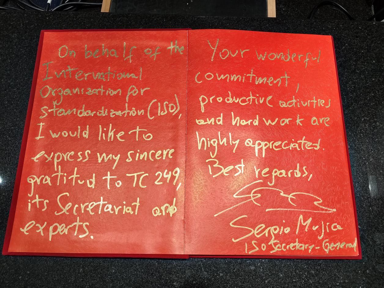 中医药国际标准化的发展成就给塞尔吉奥·穆希卡留下深刻印象。在考察后,他饶有兴致地在留言簿上挥笔写下感言,向ISO/TC 249秘书处及其专家团队表达了真挚的谢意,并对ISO/TC 249所取得的卓越成就表示肯定。