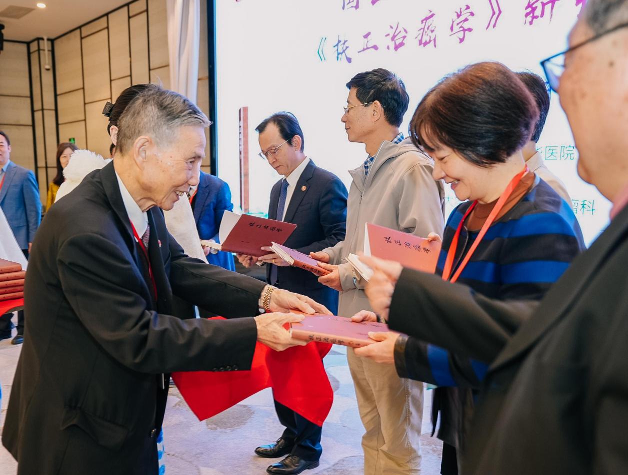 与会嘉宾共同为《扶正治癌学》新书首发揭牌,刘嘉湘教授向嘉宾赠书。