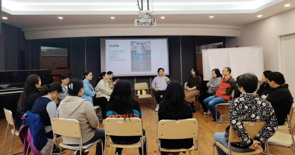 此次工作坊根据教职工的需求定位,以固本和培元为目标设计了“面对应试教育的现状,如何做守护孩子身心健康的智慧家长”以及“在不确定的时代,家长如何学会自洽和自我赋能,提升带娃幸福指数”两次不同主题的课程。活动中刘晔萍教授结合老师们反馈的亲子关系中真实发生的案例与遇到的家庭教育难题,借助萨提亚冰山模型分析老师们在情绪、行为背后看不见的、不易觉察到的感受、渴望、期待、信念等要素,通过引导性的追问,帮助老师们理清问题、明确感受、疏通“堵点”和“痛点”。并用家庭关系“雕塑”的形式,把复杂的亲子关系外显、具象化,让老师们内在的看不到、不易察觉、一直被忽略的内在影响因素被看到,听到自己内心对于亲子养育、家庭教育中个人角色和定位的深层渴望和期待,从而寻找触发改变和悦纳自己的力量和勇气。