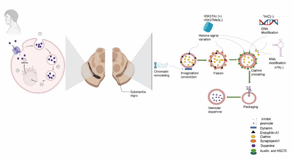 图:多种表观遗传方式调控介导的DAT内吞过程异常对PD早期病理进程产生重大影响。