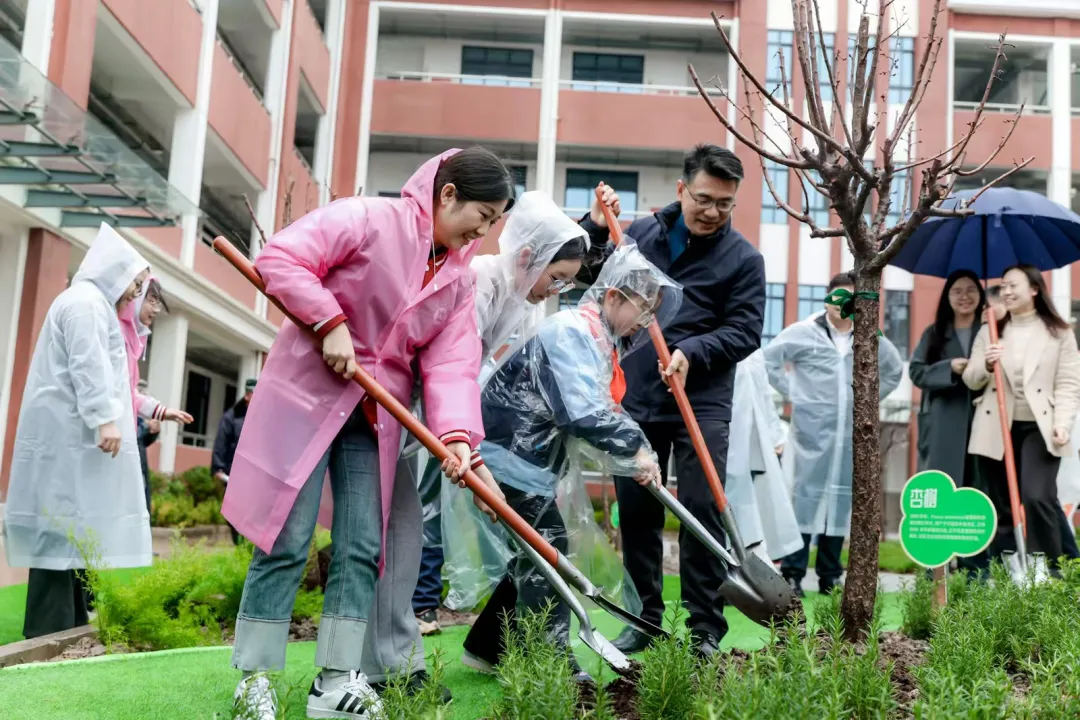 活动最后,师生们迎着春雨,穿越青绿拱门,携手走进百草园,手持药锄,共同种下一棵棵象征中医药文化薪火相传的杏树,愿来年杏花香飘满园。