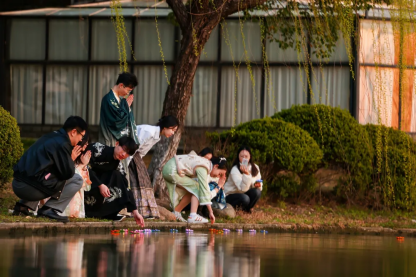 芳华绽放的杏花湾旁,传统文化集市“杏林游园会”人头攒动,将整片杏花湾化作流动的传统文化画卷。集市上,各类传统文化与非遗技艺的体验展示琳琅满目,香囊制作、中草药辨识等中医药文化体验为师生带来杏林探秘的沉浸之旅;剪纸艺术、中国书法、抖空竹等非遗技艺展示让师生邂逅了穿越千年的文化交响;学生心理健康集市采取投壶、沙包等传统运动健心,绘画等表达性艺术健心等互动方式,让学生释放青春活力;现场的汉服展示、舞蹈表演、功法教学更是营造了浓厚的传统文化艺术氛围。夜幕降临,三星河畔灯火闪烁,师生们共同参与传统民俗文化活动——放水灯,一盏盏承载美好期许的灯船随波而行,宛若星河洒落河面。