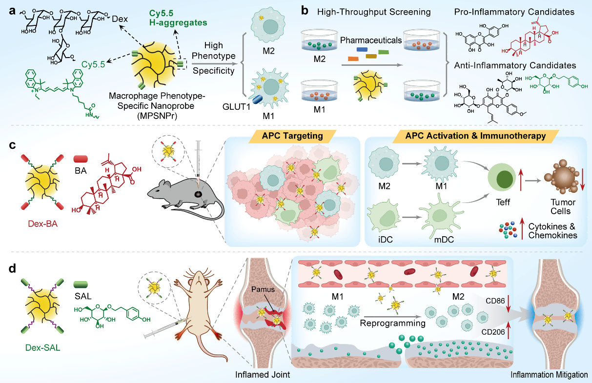 巨噬细胞在肿瘤、关节炎等代谢性疾病的发生发展中扮演了重要角色,但如何高效发现可有效调控巨噬细胞重编程的候选药物进而用于上述代谢性疾病的有效治疗,仍面临诸多挑战。基于此,研究人员创新性地开发了一种可特异性识别巨噬细胞炎性表型的多糖纳米探针(MPSNPr),该纳米探针巧妙地利用了染料分子H-聚集体及GLUT1受体的协同作用,实现了对巨噬细胞促炎表型的高特异性识别。借助该纳米探针,研究者构建了基于活细胞的抗炎药物高通量筛选平台,并从自建中药天然产物及衍生物库中规模化筛选发现了多种可有效调控巨噬细胞炎性表型(包括促炎/抗炎)的中药活性成分。进一步从中选择了白头翁活性成分白桦脂酸(BA)和红景天活性成分红景天苷(SAL)为研究对象,分别构建了基于葡聚糖的多糖纳米免疫佐剂Dex-BA和Dex-SAL。在小鼠B16F10肿瘤模型中,Dex-BA相比于BA可更显著地抑制肿瘤的生长、促进抗原呈递细胞熟化并提升CD8+ T细胞浸润和活性,实现了高效肿瘤免疫治疗。在CIA小鼠类风湿性关节炎模型中,与原型红景天苷相比,Dex-SAL更加显著地降低了类风湿性关节炎小鼠的炎症水平,并有效缓解了类风湿性关节炎症状。综上,上述研究通过构建可特异性识别巨噬细胞炎性表型的多糖纳米探针,实现了调控巨噬细胞炎性表型活性分子的高效发现及疾病有效治疗,相关工作为靶向巨噬细胞的药物研发提供了新的研究策略和研究示范。