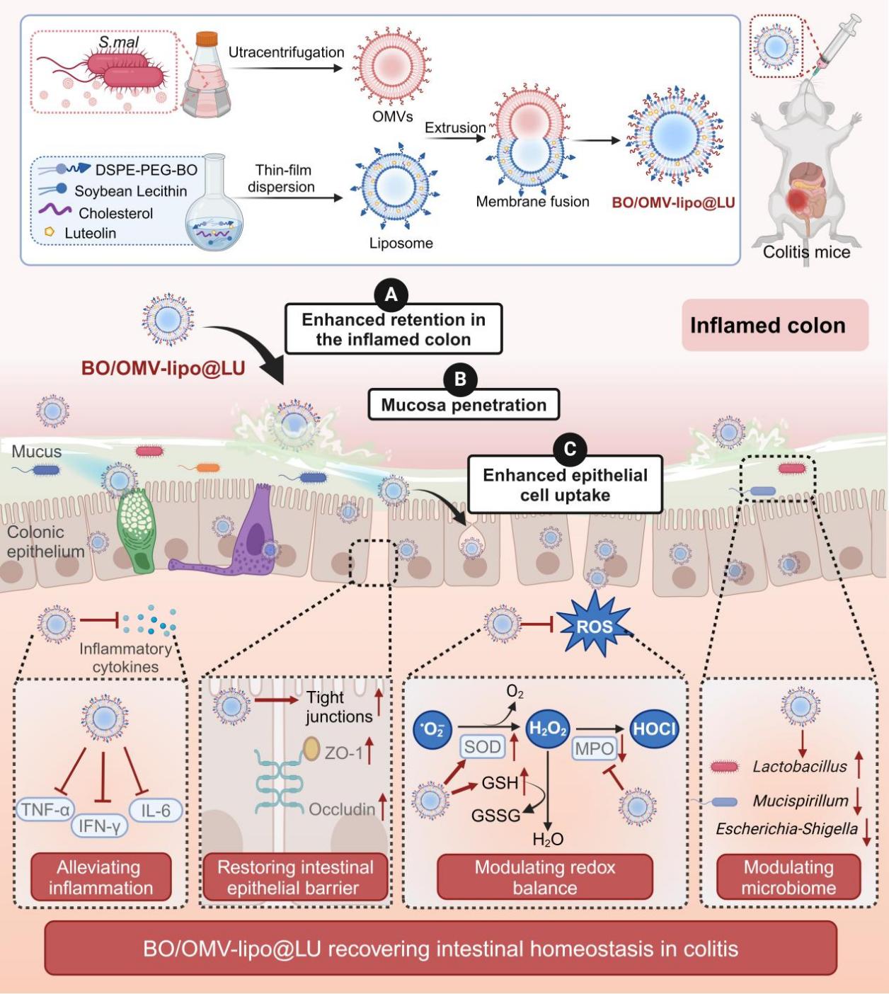近日,beat365官网中药学院胡凯莉团队通过构建冰片修饰细菌外膜囊泡融合脂质体(BO/OMV-lipo@LU),实现了木犀草素向炎症结肠部位的口服靶向递送,有效修复肠道稳态,提高了木犀草素对结肠炎的治疗效果。研究成果Chemotaxis-driven hybrid liposomes recover intestinal homeostasis for targeted colitis therapy发表在药剂学领域权威国际期刊Journal of Controlled Release。