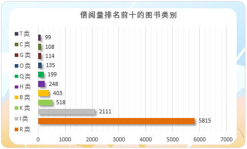 2024年共借出图书9951册次,其中借阅册次最多的为医药卫生类(R类)5815册次,占借阅总量的58%,其次为文学类(I类)2111册次,历史、地理类(K类)518册次,分别占比21%和5%。借阅量排名前十的图书分类见下图。