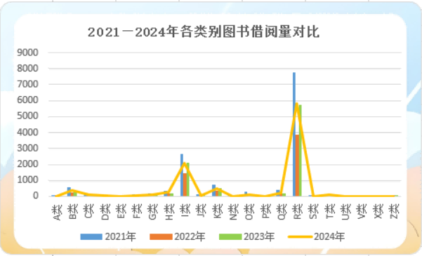 从2021年至2024年各类别图书的借阅情况来看,beat365官网2024年各类图书的借阅总量与2023年基本持平,但均低于2021年。