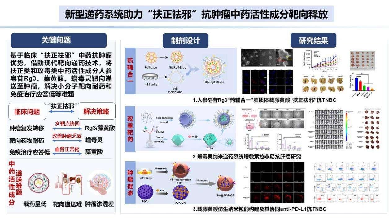 “新型递药系统助力抗肿瘤中药活性成分靶向释放”项目建立了中药皂苷“药辅合一”脂质体、细胞膜仿生递药系统等高效靶向肿瘤的纳米药物递送技术,在“扶正祛邪”理论指导下,将扶正固本类中药代表性活性成分人参皂苷Rg3和以毒攻毒类中药代表活性成分藤黄酸、蟾毒灵,靶向递送至肿瘤组织及转移病灶,可增强机体抗肿瘤免疫、缓解肿瘤乏氧、促进肿瘤血管正常化等,改善小分子靶向耐药和免疫治疗应答低等问题。研究成果2024年发表在Advanced Material、Chemical Engineering Journal和Advanced Healthcare Materials等期刊。系列工作采用新型递药系统助力扶正祛邪抗肿瘤中药药效发挥,为抗肿瘤创新药物制剂开发提供了新思路。该项目主要由张彤、丁越、兰金帅、黎哲和师资博士后曾瑞峰等完成。