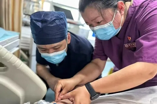 她抱起超声仪器,小心翼翼调整探头角度,在患者胫前静脉锁定目标后,拿起动脉穿刺针进行穿刺。针尖刺入皮肤的刹那,患者肌肉轻轻颤动,暗红色的血液缓缓流入针管,所有人紧绷的神经才稍稍放松。监护仪上的血压数字开始回升时,王晶仍保持着进针的姿势,直到确认留置针稳妥固定。“你们比我们还上心……”患者家属抹着泪握住两人的手,此时王晶的上衣已被冷汗浸湿……