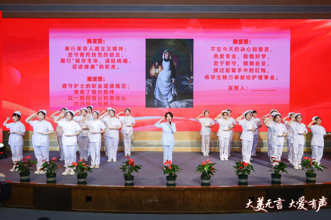 最让人期待的授帽仪式上,即将实习的 “准护士” 们排着队走到南丁格尔像前。当护理前辈们为他们戴上燕帽、点亮蜡烛,他们接过护理前辈手中的蜡烛,铿锵誓言激扬青春力量,愿做有担当、有温度的护理人。