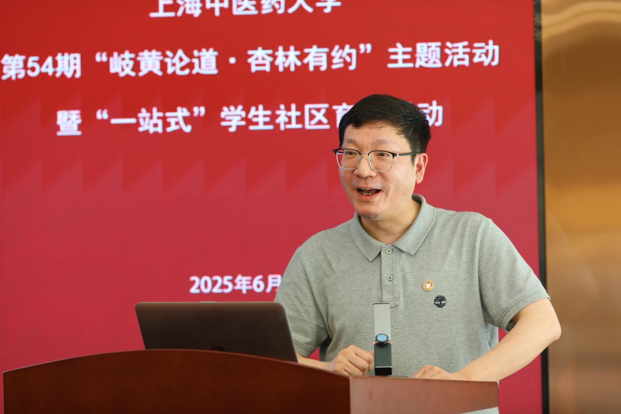 6月18日下午,第54期“岐黄论道·杏林有约”主题活动暨“一站式”学生社区育人活动举办。为迎接学校70周年校庆,本期活动围绕“以仁心护万家 用坚守写芳华”主题,特邀三位长期耕耘在基层医疗领域的杰出校友——“全国先进工作者”严正、“上海市劳动模范”朱震年、“上海市优秀社区卫生管理者”张扬回到母校,分享基层服务心路。校党委副书记沈辉为三位嘉宾颁发“阳光导师”聘书,副校长舒静赠送“非遗剪纸工艺”校友纪念品。学校相关职能部门负责人、师生代表60余人现场参与。