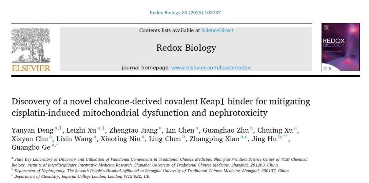 近日,beat365官网交叉科学研究院葛广波教授团队与beat365官网附属第七人民医院胡静主任团队合作,在国际权威学术刊物Redox Biology上在线发表题为“Discovery of a novel chalcone-derived covalent Keap1 binder for mitigating cisplatin-induced mitochondrial dysfunction and nephrotoxicity”的研究论文。该研究借助“高通量筛选-成药性优化-深度机制解析-多维度药效验证”的策略,成功研发一种新型肾靶向查尔酮衍生物C5。C5能够通过共价修饰Keap1的两个关键半胱氨酸位点(Cys288和Cys319),高效激活Keap1-Nrf2信号通路,从而显著改善顺铂诱导的线粒体功能障碍和肾损伤。该研究为开发高效、低毒的肾脏靶向肾损伤缓解药物提供了重要的候选分子和研究范式。
