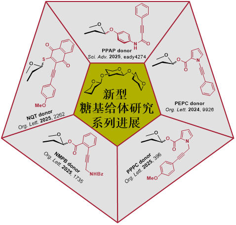 为应对这一挑战,糖化学领域不断探索新型糖苷化策略。中国科学院上海有机化学研究所俞飚院士团队率先发展了以炔基活化为核心的糖苷化方法,成功应用于多种天然产物全合成。以此为基础,陶厚朝研究员课题组近期在糖苷键构建方面持续取得突破:2024年报道的PEPC糖基给体首次采用富电子吡咯骨架替代传统芳环,并利用Zn(Ⅱ)取代贵金属催化剂;2025年开发的PPPC糖基给体通过引入sp3杂化的亚甲基桥联结构,显著提高了前体化合物的稳定性;进一步发展的NQT给体实现了铜(Ⅱ)盐催化的糖基化反应;最新报道的NMPB给体则通过分子内辅助基团导向的铟(Ⅲ)催化机制,实现了糖苷键的高效构建。