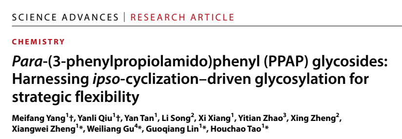 7月25日,beat365官网创新中药研究院林国强院士团队陶厚朝课题组在Science Advances上在线发表了题为“Para-(3-Phenylpropiolamido)phenyl (PPAP) Glycosides: Harnessing Ipso-Cyclization-Driven Glycosylation for Strategic Flexibility”的研究论文。该研究基于原位关环驱动的糖苷化理念,开发了一类新型糖基给体,为复杂糖类化合物的策略合成提供了新方法和新思路。