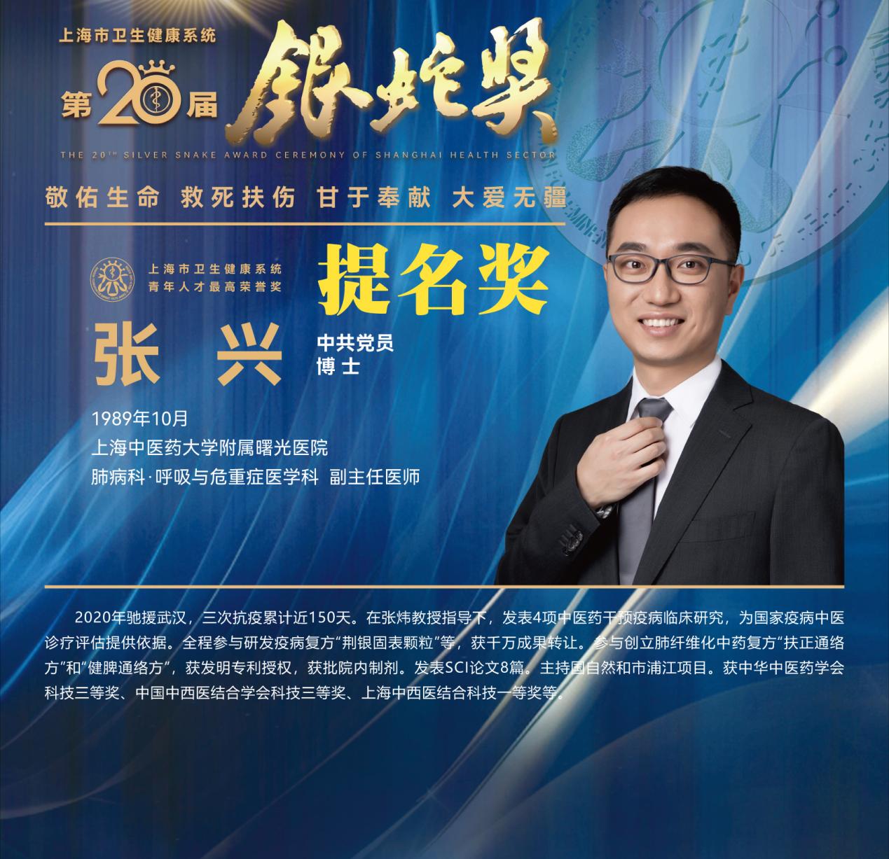 张兴,中共党员,医学博士,肺病科·呼吸与危重症医学科副主任医师,硕士研究生导师。入选中华中医药学会青年托举人才、上海浦江人才、上海医苑新星青年医学人才-优秀结业学员、《中华中医药杂志》青年中医药求真学者、beat365官方网站后备卓越中医人才。主持国家自然科学基金和省部级课题4项;发表第一/通讯作者(含共同)SCI及核心期刊论文二十余篇,含中科院1区1篇、JCR Q1 4篇;参与研制院内制剂3项、授权专利5项、成果转化2项。