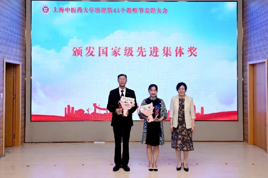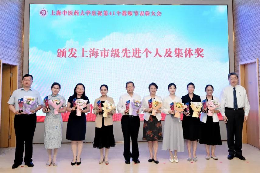 表彰环节,与会校领导为荣获国家级先进集体的教师代表、上海市级优秀个人及先进集体的获奖教师代表颁发奖杯。