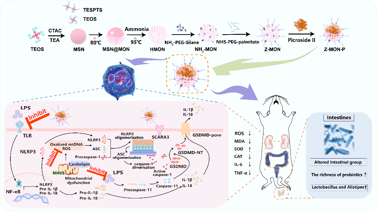 胡黄连苷II是从中药胡黄连中提取的黄酮类化合物。前期研究表明胡黄连苷II能同步有效抑制焦亡并改善肠道菌群失调,是紧扣脓毒症二大关键病理环节治疗脓毒症的理想天然药物。然而,因代谢速率过快、非特异性分布等药代动力学缺陷,严重影响了其临床应用与疗效。在分析优化既往研究与技术的基础上,陈伟团队利用棕榈酸可选择性通过SCARA3受体介导的内吞作用进入细胞,同时可结合Toll样受体的特性,运用独具中国特色的最新纳米技术,采用棕榈酸修饰硅质纳米颗粒并负载胡黄连苷II—(Z-MON-P),成功研发出具有大比表面积、良好生物相容性和易功能化的新型硅质纳米中药颗粒制剂Z-MON-P。