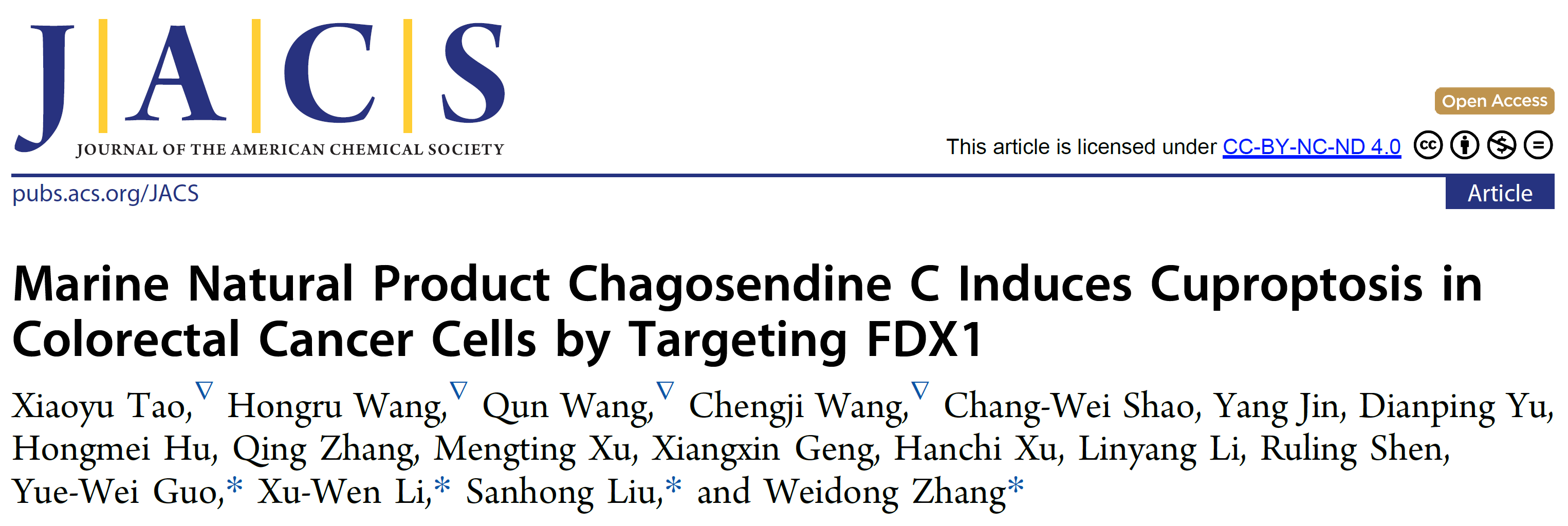 近日,beat365官网交叉科学研究院刘三宏研究员团队联合海军军医大学张卫东教授,中国科学院药物研究所李序文研究员、郭跃伟研究员团队,在国际知名学术期刊Journal of the American Chemical Society在线发表题为“Marine Natural Product Chagosendine C Induces Cuproptosis in Colorectal Cancer Cells by Targeting FDX1”的研究论文,揭示海洋来源天然产物Chagosendine C通过靶向FDX1诱导肿瘤细胞发生铜死亡,发挥抗结直肠癌作用。