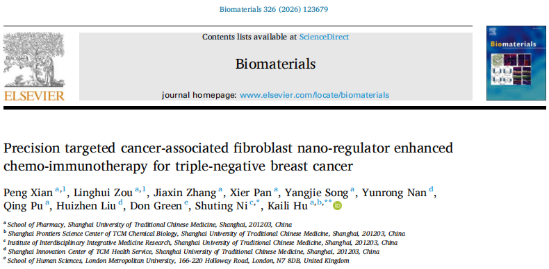 中药学院胡凯莉团队设计精准靶向癌症相关成纤维细胞的纳米调节器增强三阴性乳腺癌化疗免疫疗法
