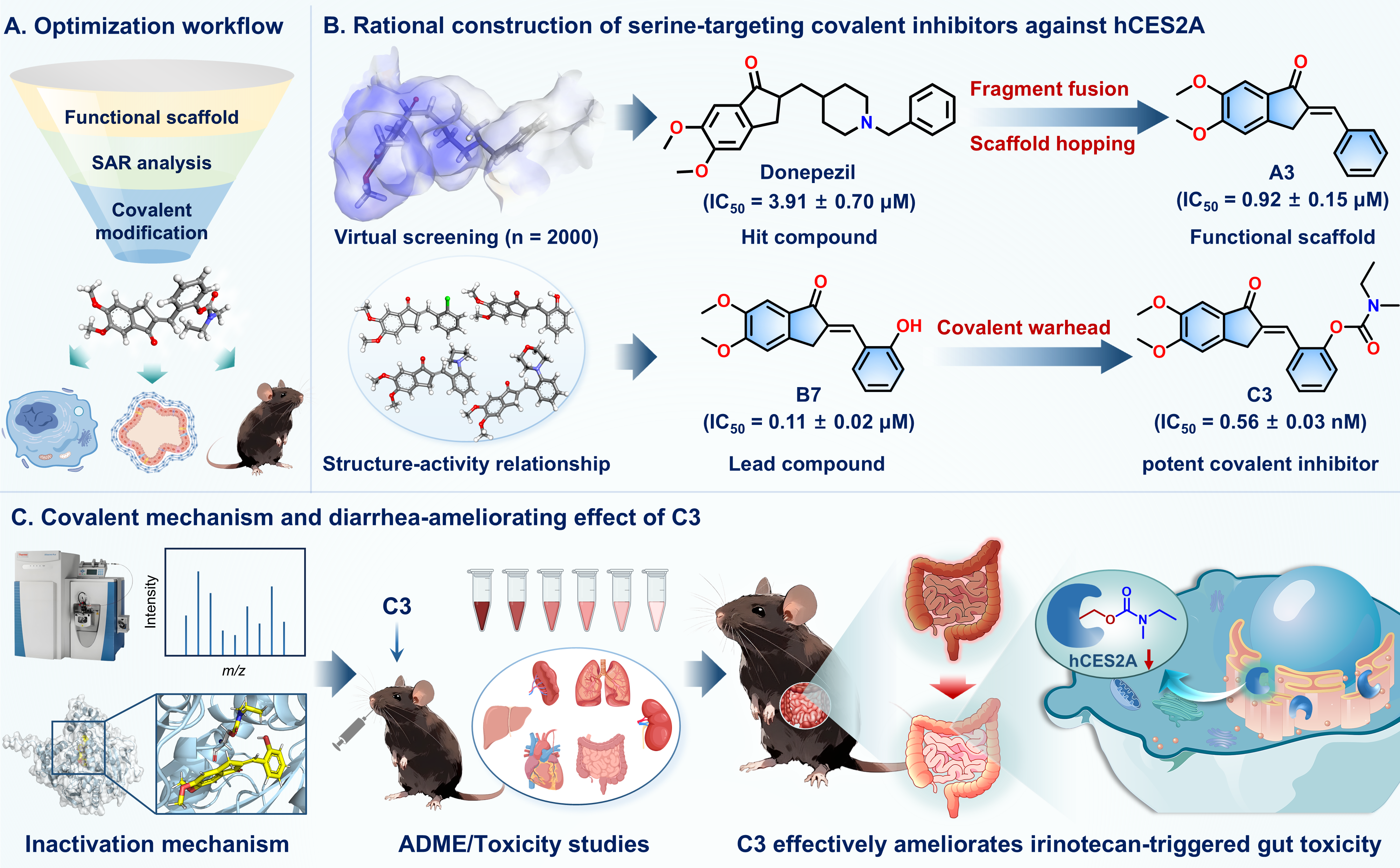 针对上述问题,研究团队采用基于结构的虚拟筛选和高通量酶抑制实验相结合的策略,从2000种FDA批准上市药物中筛选出了多奈哌齐(Donepezil)作为hCES2A的中等强度抑制剂(IC50 = 3.91 μM)。随后,利用片段融合、骨架跃迁、构效关系分析及共价靶头修饰等系列策略,成功研发出新型氨基甲酸酯类共价抑制剂C3(IC50=0.56 nM)。C3能够特异性共价修饰hCES2A催化空腔内的关键丝氨酸残基(Ser-228与Ser-236),并以时间和剂量依赖的方式强效抑制hCES2A活性。共价对接和分子动力学模拟进一步揭示:C3的氨基甲酸酯部分可使hCES2A催化口袋构象更趋紧凑,从而阻碍底物进入催化口袋。C3口服后展现出良好的安全性与高肠道暴露特性,其可在肠S9、活细胞、肠道类器官及荷瘤小鼠等多个生物维度中有效抑制hCES2A水解活性,从而显著缓解CPT-11引起的肠毒性。该研究不仅为改善CPT-11诱导的肠道毒性提供了极具潜力的候选药物,也为开发靶向丝氨酸水解酶的共价抑制剂提供了重要的研究范例。