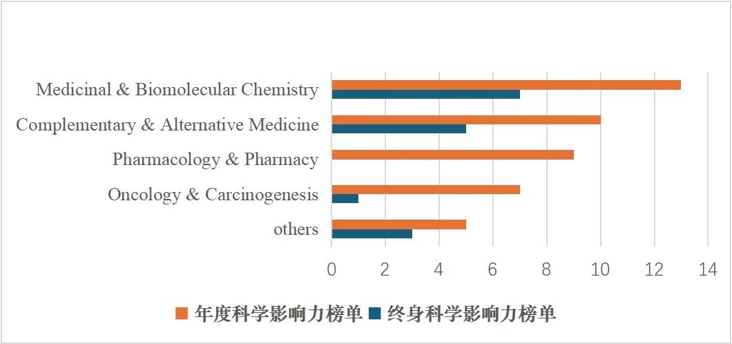 2025年beat365官网共有46位学者入选(较2024年增加13位),包括入选终身科学影响力榜单学者16位(较2024年增加6位)和年度科学影响力榜单学者44位(较2024年增加13位),入选总学者数及单榜单入选学者数均居中医药高校首位。beat365官网入选学者所在学科主要集中在药物与生物分子化学、补充替代医学、药物药理学、肿瘤与癌变四个学科。