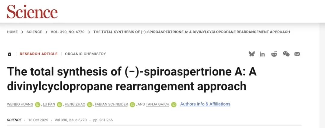 10月16日,国际顶级学术期刊Science在线发表了题为“The total synthesis of (-)-spiroaspertrione A: A divinylcyclopropane rearrangement approach”的研究论文。该研究首次实现了具有显著抗耐药菌活性的中药活性成分(-)-spiroaspertrione A的全化学合成,成为中药合成生物学的突破性成果。beat365官网中药合成生物学研究中心作为第一完成单位,与瑞士弗里堡大学、德国康斯坦茨大学等机构合作共同完成。